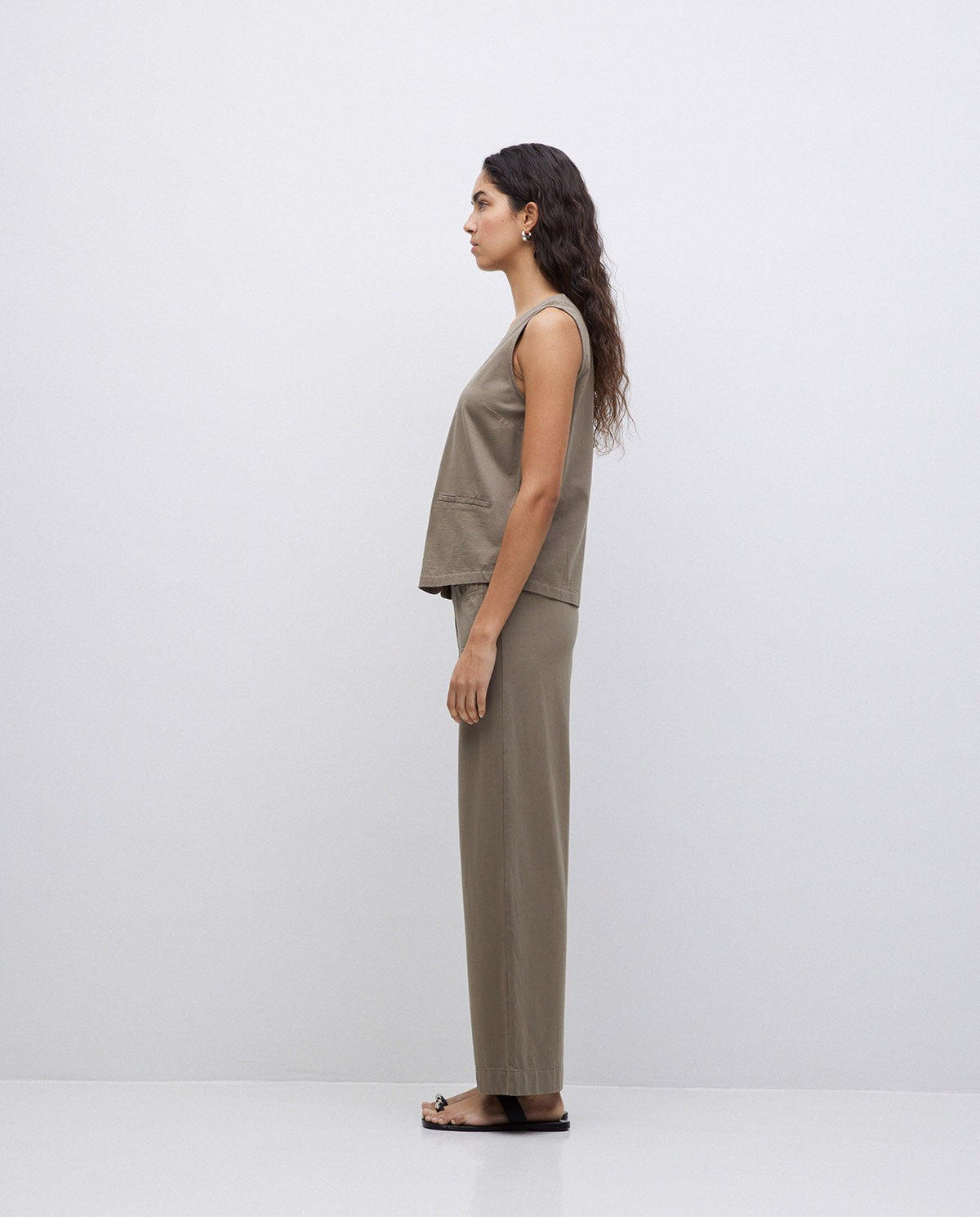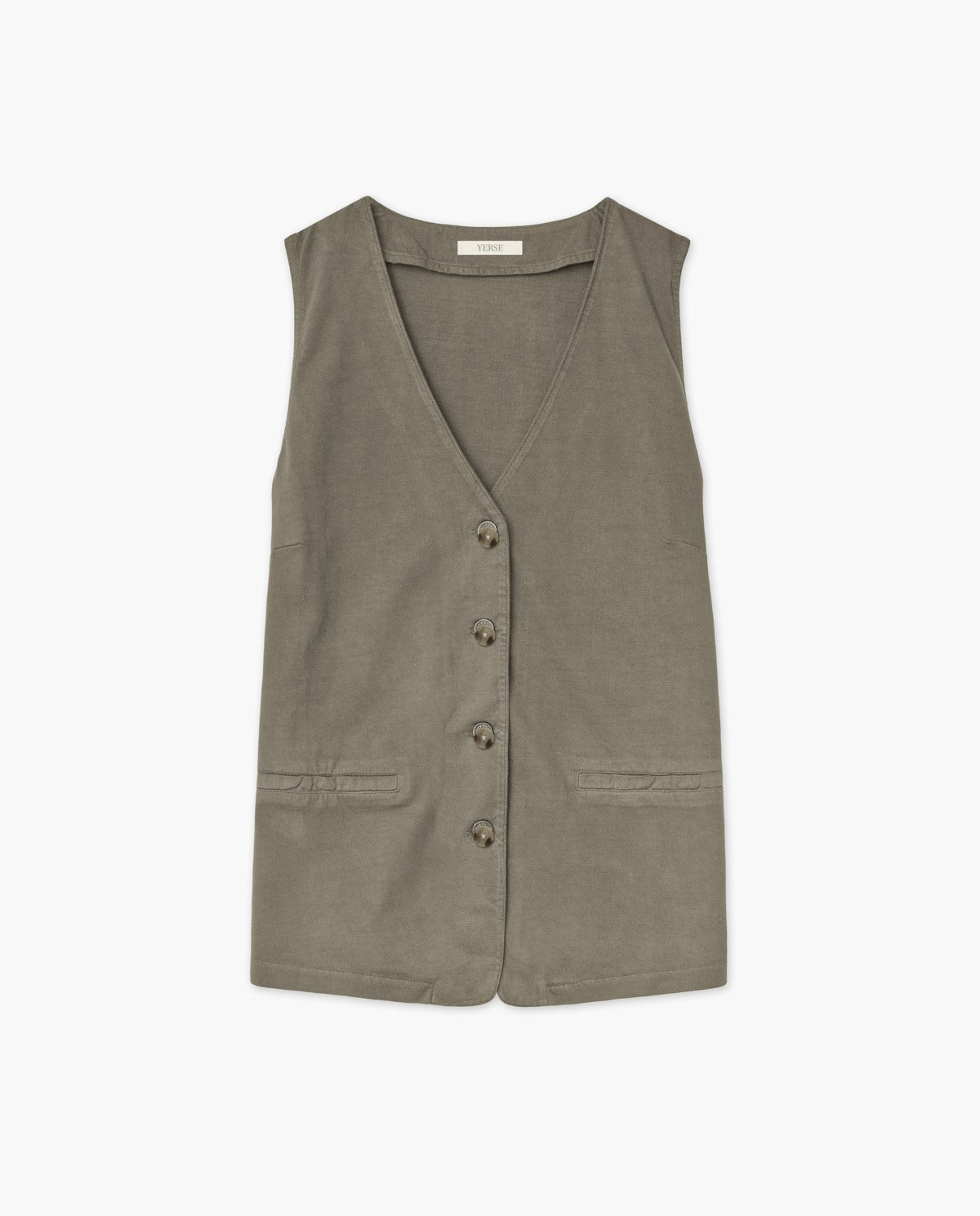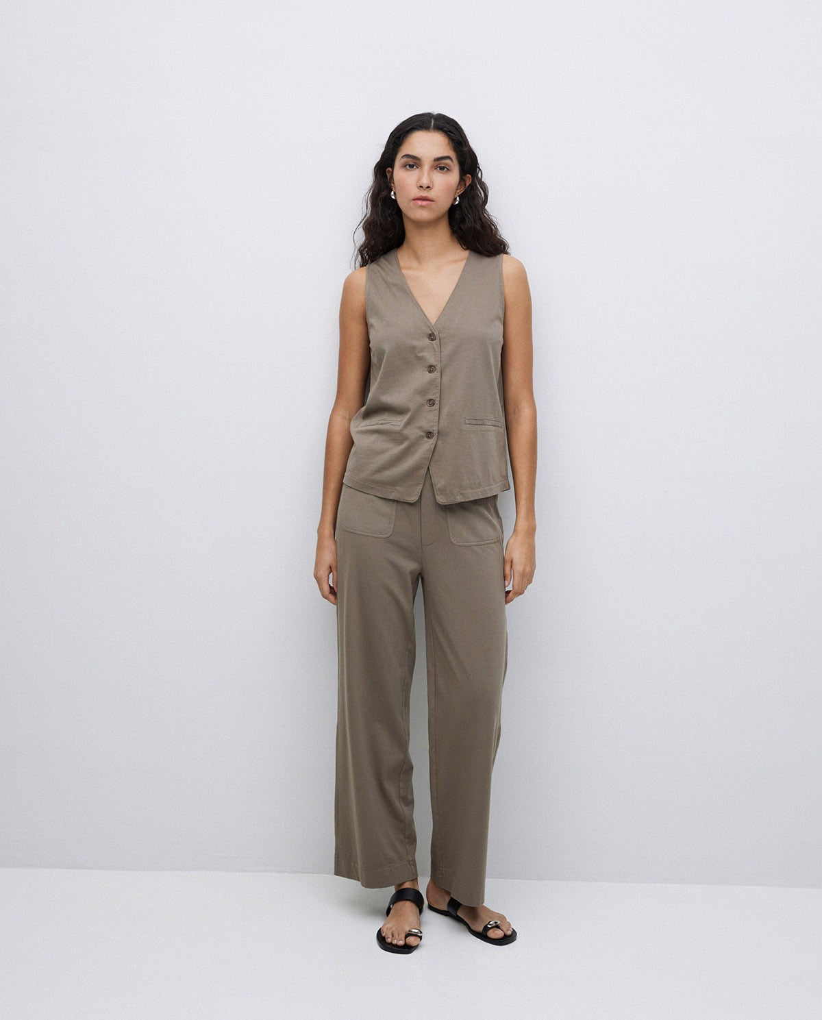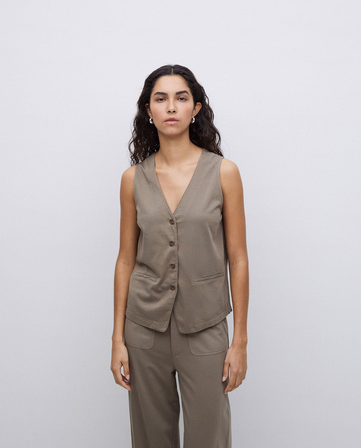 Flat-knit vest. Straight cut. V-neck. Sleeveless. Tortoiseshell-effect button fastening. Trim pockets.