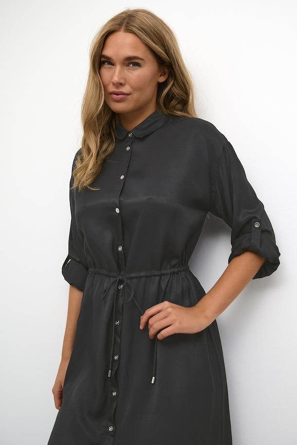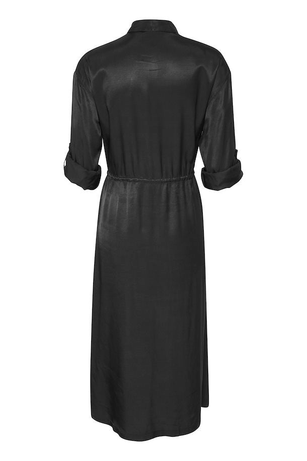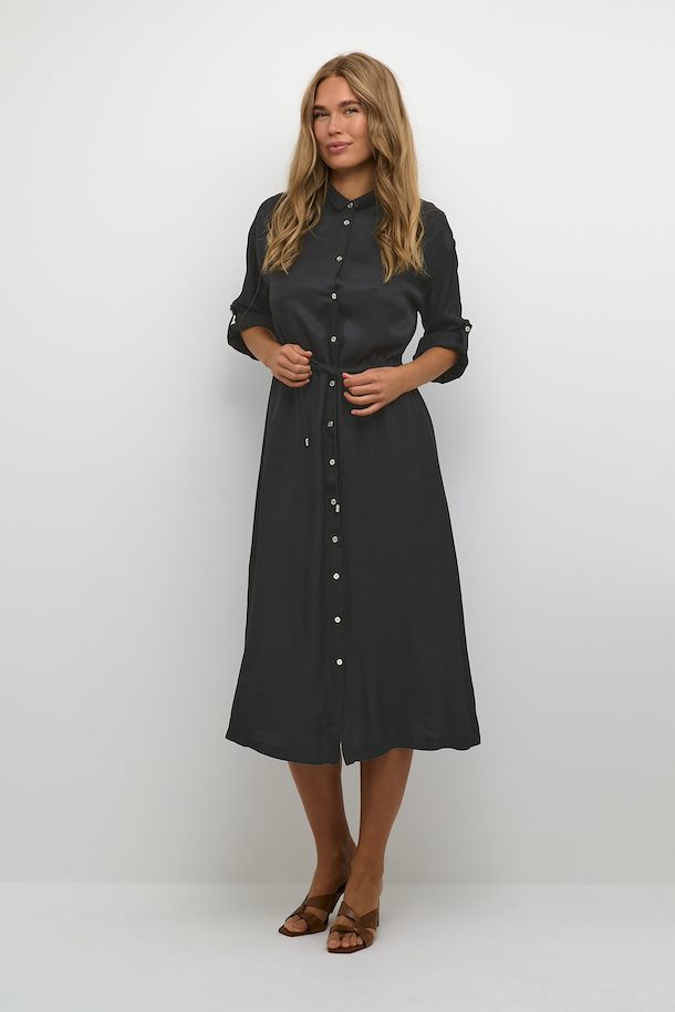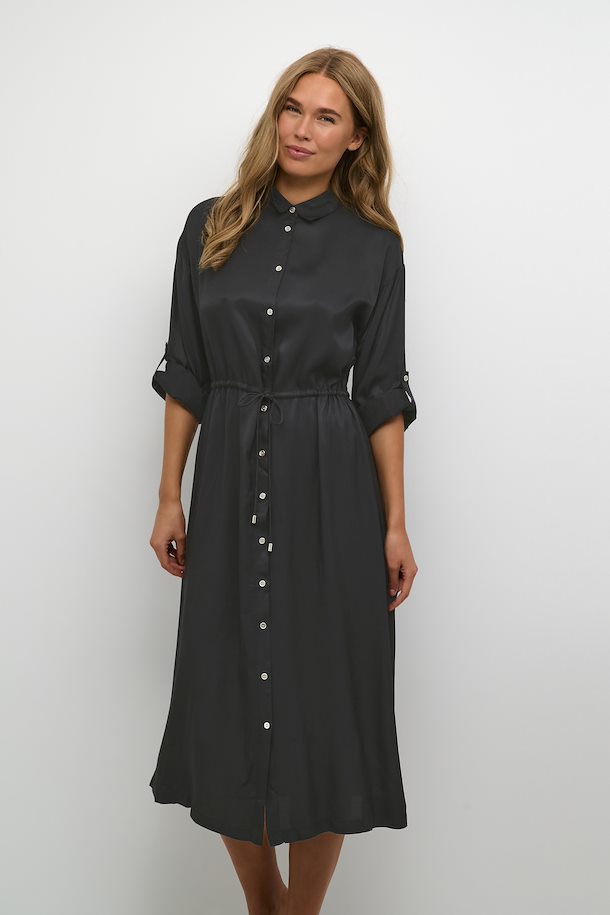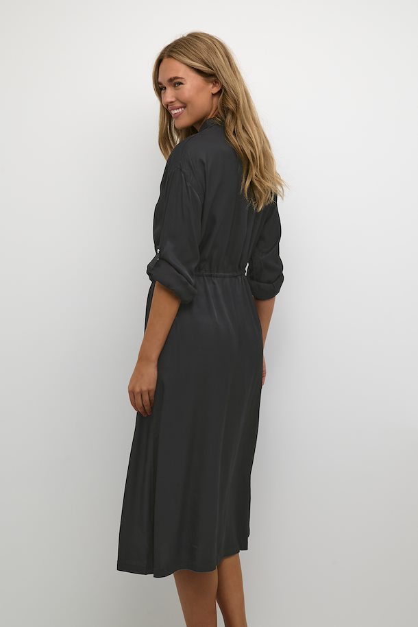 Long-sleeve midi shirt dress. Side slit at the hem. You can choose your normal size.