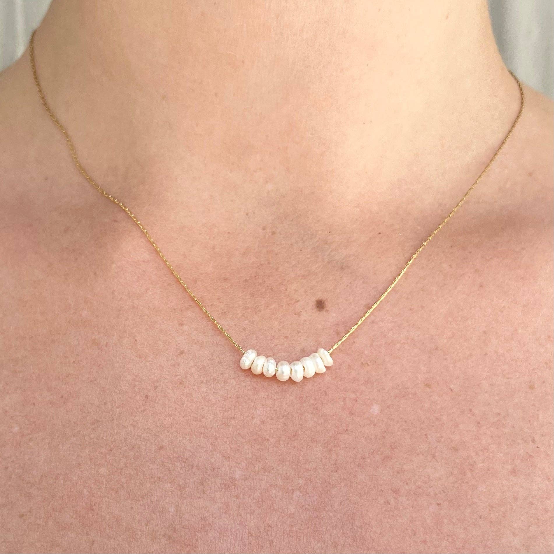 A fine, thread chain necklace with 8 natural pearl beads, perfect as a base chain for layering necklaces. Polished gold plated finish, that won’t fade or tarnish
