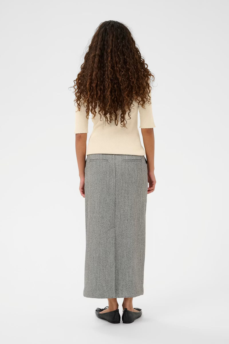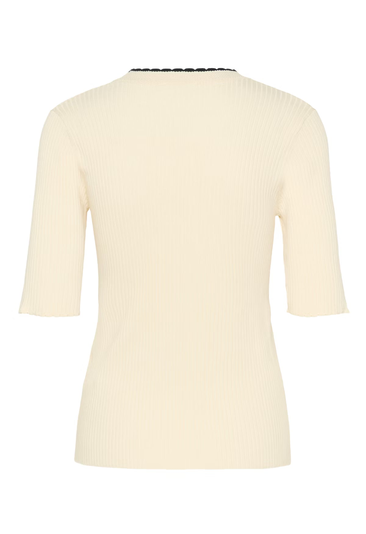 This ribbed knit top features a fitted silhouette, straight hem, classic crew neckline, and mid-length sleeves with subtle scalloped edges for a refined finish.