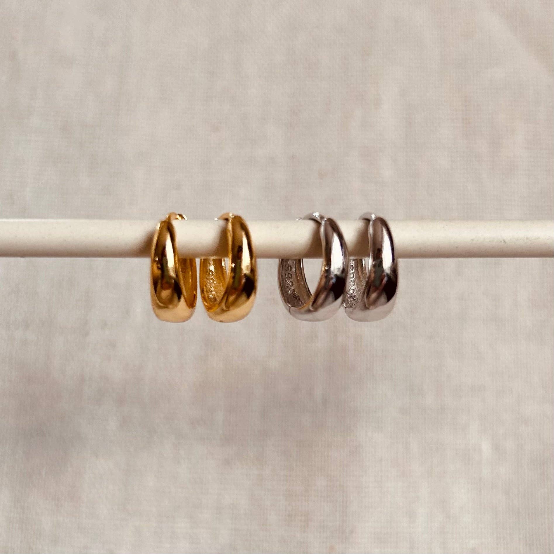 These simple, elegant hoops are a stylish way to add a touch of elegance to any outfit. The chunky huggie design makes them comfortable to wear and the striped embossed detail creates a timeless look. Perfect to wear day or night.