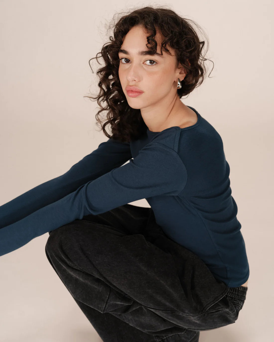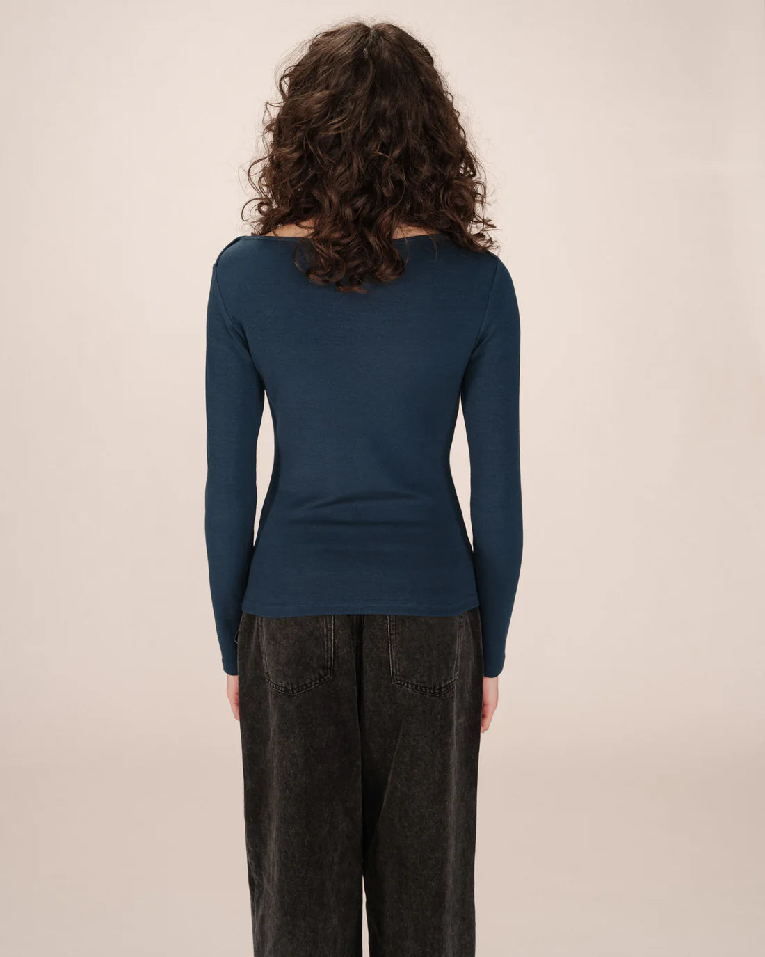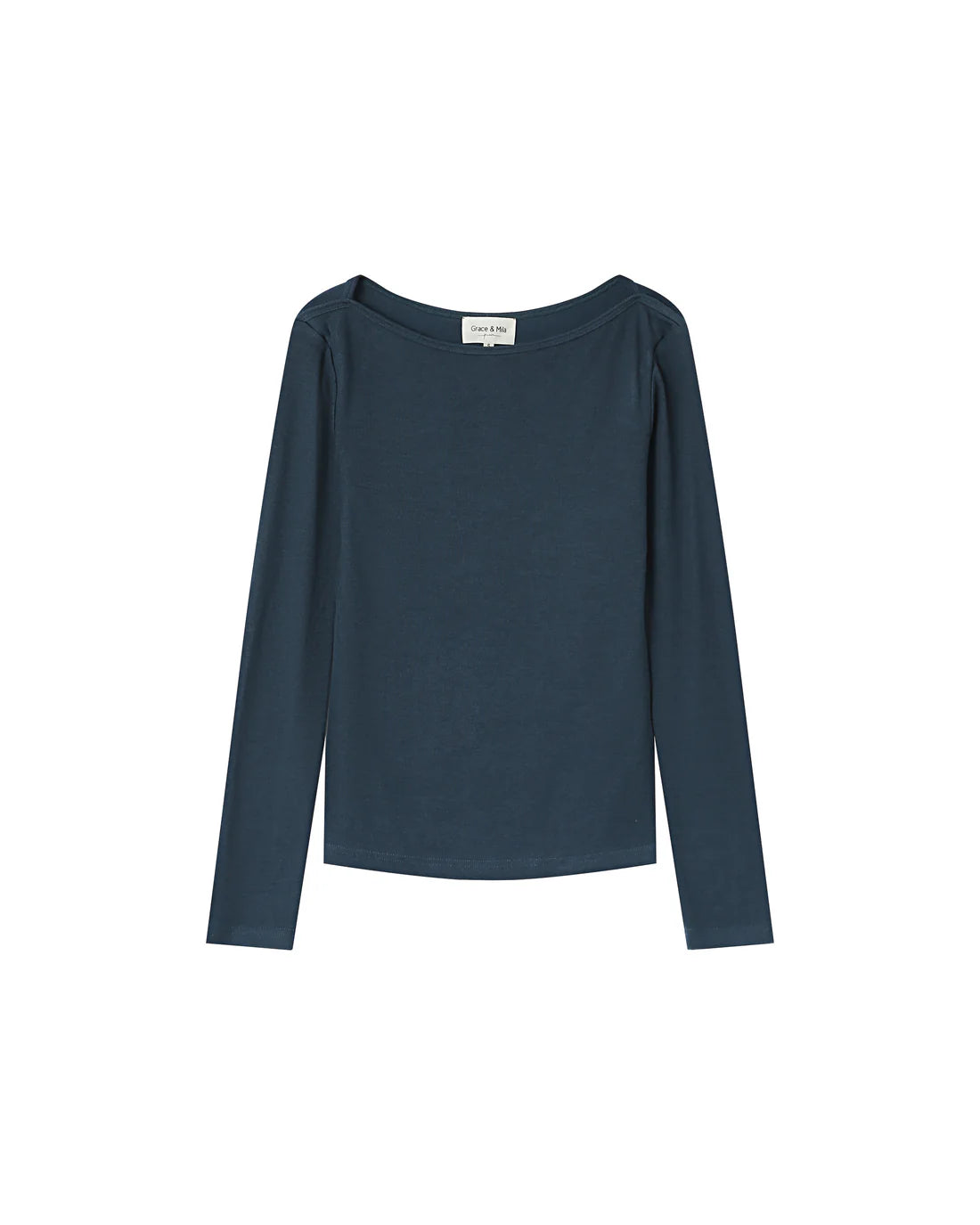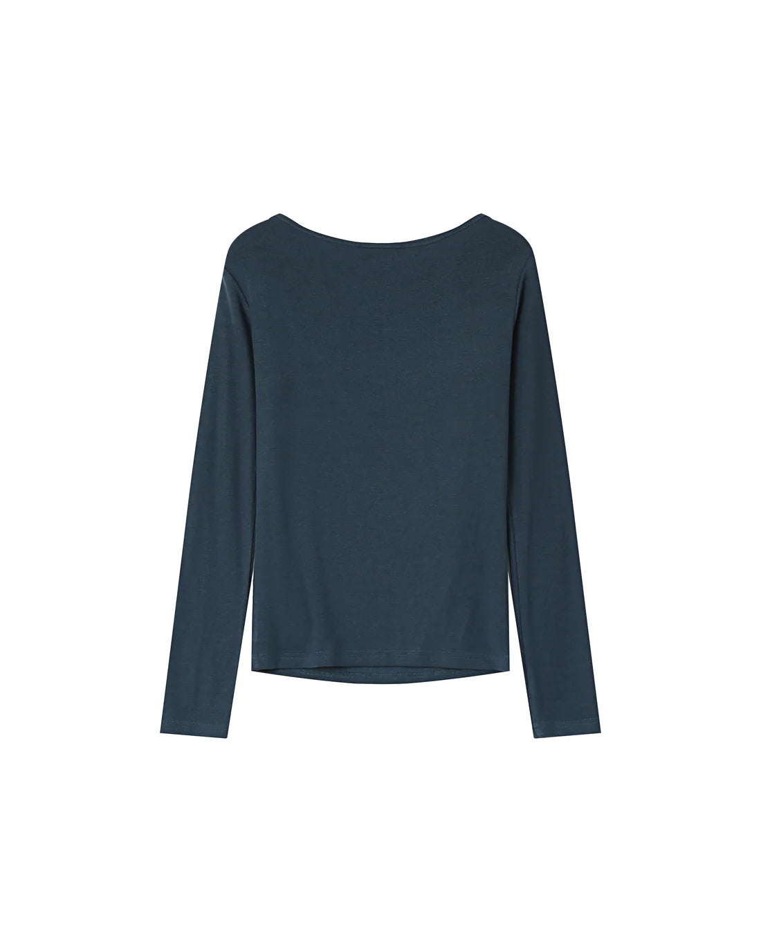 The long-sleeved t-shirt , with its clean and minimalist lines, is designed for a feminine and structured silhouette. The fitted cut enhances the figure, while the boat neckline stands out with a crossover finish on the shoulders. The boat neck top is an easy piece to integrate into your everyday wardrobe.